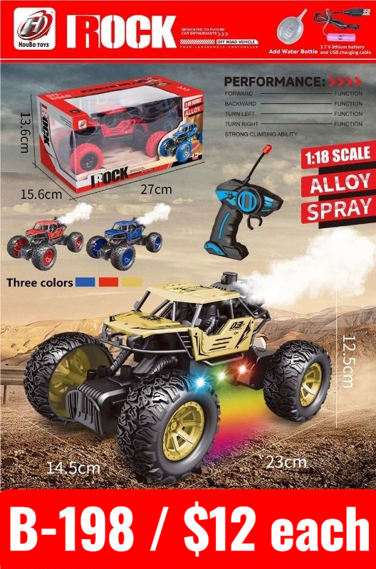 The B-198 Alloy Spray RC Rock Crawler is built for extreme adventure and off-road fun! With a 1:18 scale and powerful climbing ability, it’s designed to tackle rough terrain with ease. It features forward, backward, turn left, and turn right functions—plus a unique spray effect for a thrilling driving experience. The bold design comes in three stunning colors, paired with bright LED lights for night play. Durable alloy body and oversized tires ensure long-lasting performance. Ideal for kids who love action-packed RC vehicles.