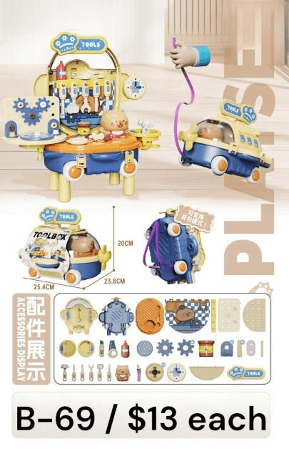 The B-69 Kids Tool Bus Playset is a fun and educational toy designed to spark creativity and curiosity in children. This 2-in-1 tool station and pull-along bus set includes various colorful tools, gears, and accessories to encourage imaginative role play. Kids can pretend to fix, build, and explore while developing fine motor skills and hand-eye coordination. When playtime is over, all accessories fit neatly inside the bus for easy storage and portability. Made from durable, non-toxic materials, this adorable playset is perfect for little builders who love hands-on fun and learning through play. Ideal for ages 3 and up!