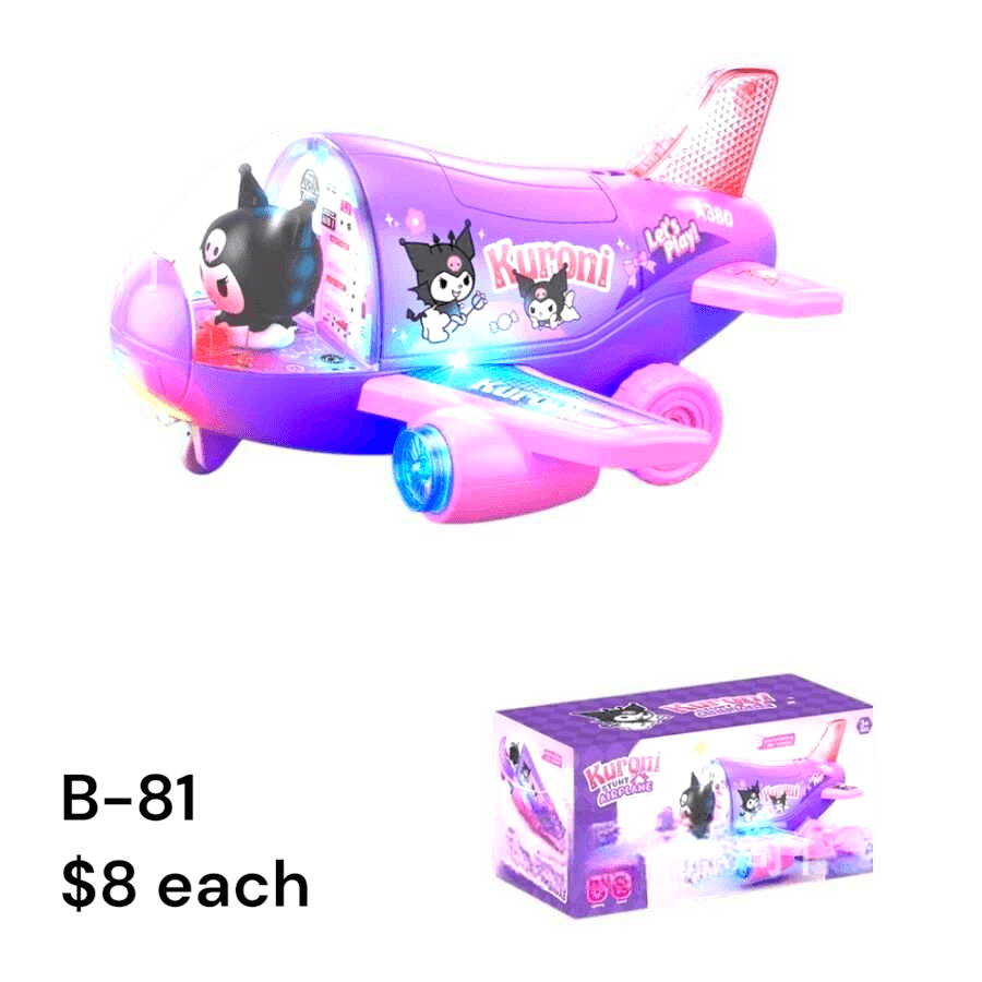 The B-81 Kuromi Light-Up Airplane Toy is a fun and exciting toy designed to keep kids entertained for hours. With its vibrant purple and pink colors, this airplane lights up and moves, making playtime extra magical. Featuring a cute Kuromi character inside, it sparks kids’ imagination and creativity. The toy is easy to use, durable, and perfect for both boys and girls. Ideal for gifting, birthdays, or just everyday fun, this airplane toy brings joy and adventure to playtime. Watch your little ones light up with excitement as they play with this adorable moving airplane!