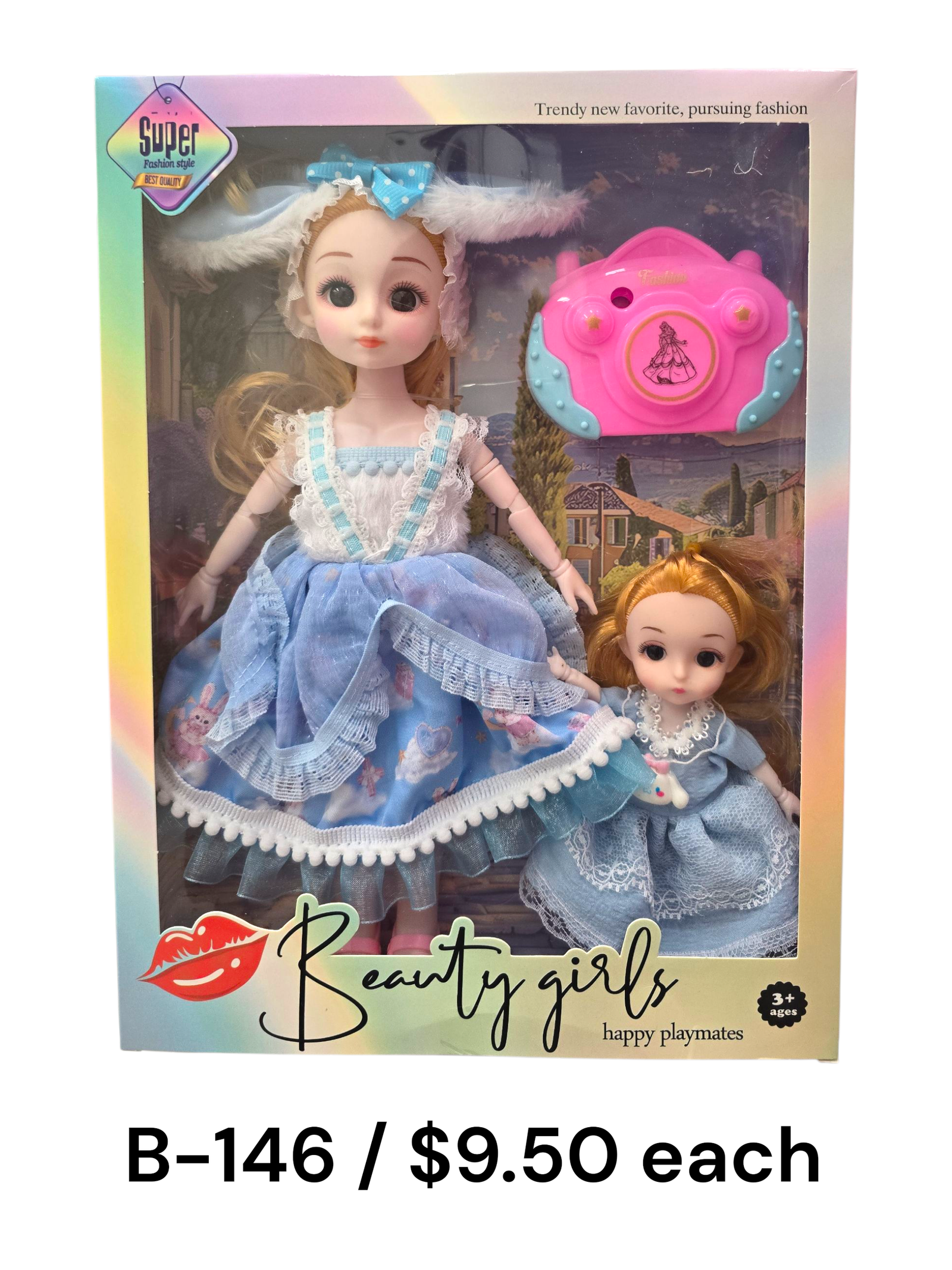 The B-146 Beauty Girls Doll Set is a charming duo designed to bring extra joy to playtime. This set includes two beautifully dressed dolls — a big sister and a little sister — both wearing matching blue lace dresses with delicate detailing. The set also comes with a cute pink toy camera, adding a fun interactive element for imaginative stories and fashion adventures. Perfect for children aged 3 and up, this doll set encourages nurturing play, creativity, and bonding. With their sweet expressions and stylish outfits, these dolls make a lovely gift for birthdays or special occasions, delighting any young doll lover.