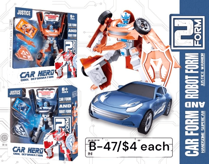 Unleash double the action with the B-47 Car Hero Transformer! This exciting 2-in-1 toy easily converts from a sleek sports car into a powerful robot warrior, giving kids endless imaginative play options. Made with durable materials, it’s perfect for epic battles and high-speed chases. The detailed design and cool transformation feature make it a fun collectible and a great gift for children ages 6 and up. Whether in robot form or car mode, this hero is ready to save the day. Add this transforming toy to your collection for action-packed adventures every day!