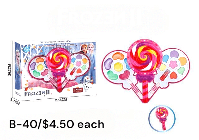 The B-40 Frozen II Candy Makeup Set is a delightful cosmetic toy designed for little fashion lovers. 💄✨ Shaped like a colorful lollipop, it opens up to reveal a fun makeup palette with multiple vibrant shades and cute applicators. Its compact and playful design makes it easy to carry and perfect for creative play. Inspired by the magic of Frozen II, it lets kids explore beauty and imagination safely. Ideal for parties, gifting, or everyday pretend play, this makeup set encourages creativity and self-expression. A sweet and magical toy every young fan will love!