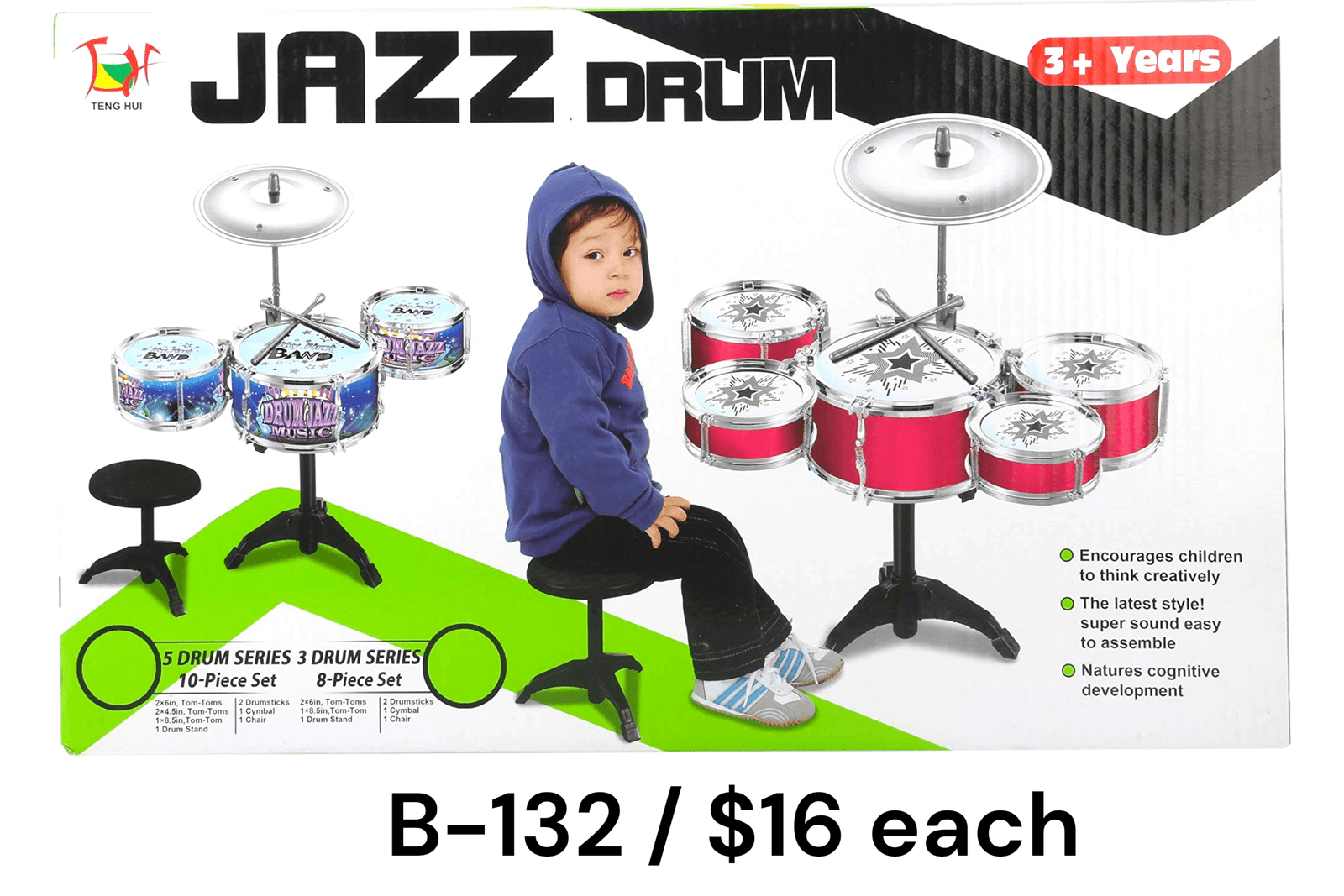 This kids’ jazz drum set is perfect for introducing little ones to the world of music. With realistic drum sounds, a sturdy design, and easy assembly, it encourages creativity, rhythm, and motor skill development. Ideal for ages 3 and up.