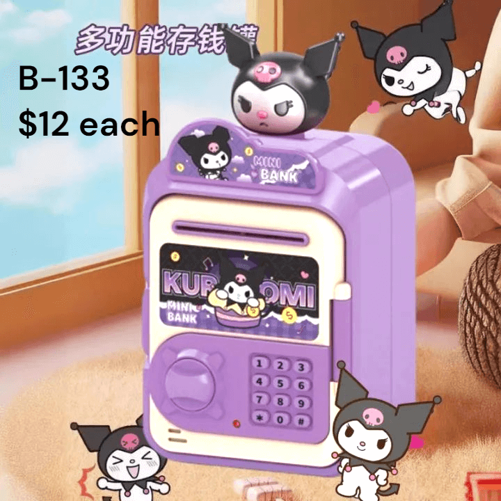 Save in style with the Kuromi Mini ATM Piggy Bank! This cute purple bank features an electronic keypad, auto note intake, and a secure coin slot — making saving fun and easy for kids. With its playful Kuromi design, it’s perfect for fans who love adorable collectibles. The compact size fits easily on desks, shelves, or bedside tables. A great gift to teach kids saving habits while adding a touch of cuteness to their room!