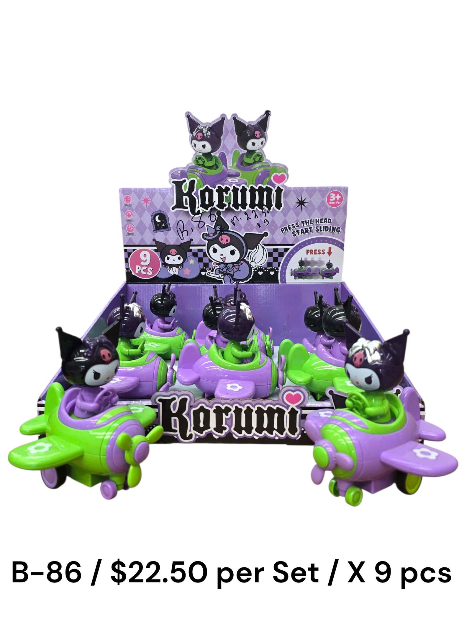 Bring playful mischief and colorful fun to kids’ playtime with the Kuromi Press & Slide Airplane Toy Set (B-86). Featuring the iconic Kuromi character, this vibrant toy set combines adorable design with interactive action that keeps children entertained for hours. Each figure is mounted on a cute airplane-style base in eye-catching purple and green colors, making it visually appealing and perfect for display as well as play.