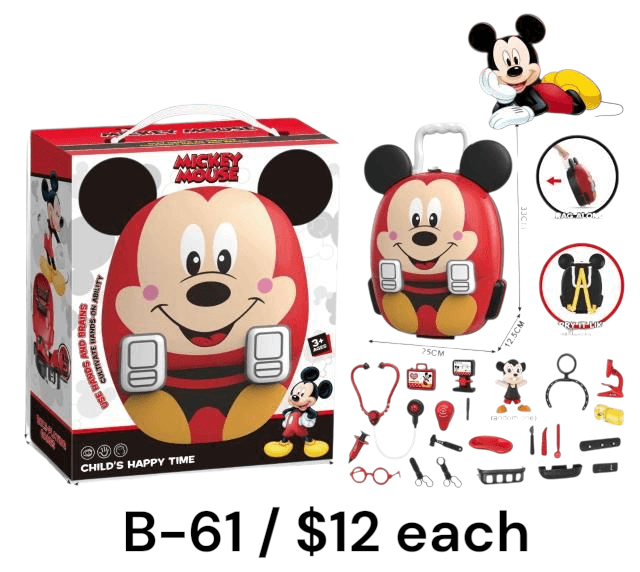 Make playtime magical with the B-61 Mickey Mouse Doctor Playset! This adorable set comes in a cute Mickey Mouse-shaped carry case, making it easy to store and take anywhere. It includes fun medical tools like a stethoscope, syringe, thermometer, glasses, and more—perfect for little doctors to role-play and explore their imagination. The durable design ensures safe and long-lasting play for kids aged 3 and up. Ideal for pretend play, gifting, and educational fun, this set encourages creativity and helps build social skills. A wonderful surprise for every Mickey fan!