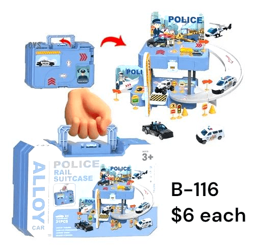 Turn playtime into an exciting police mission with the Police Rail Suitcase Playset! This fun and compact toy unfolds into a mini police station with tracks, vehicles, signs, and accessories. Kids can easily carry it like a suitcase and set it up anywhere for hours of imaginative fun. Perfect for travel, gifting, or everyday play. Designed for little hands and big adventures!