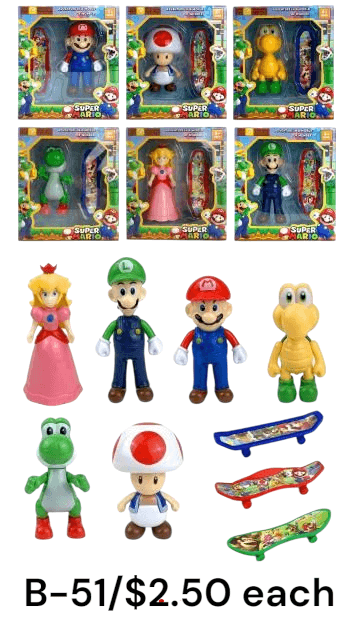Bring your favorite characters from Super Mario to life with these fun collectible figures! The B-51 Super Mario Figures with Skateboards feature popular characters like Mario, Luigi, Princess Peach, Yoshi, Toad, and Koopa — each paired with a cool mini skateboard. Perfect for both play and display, these figures are ideal for kids and collectors alike. Their vibrant colors and detailed designs make them a great gift for fans of the iconic game. Add a touch of adventure and nostalgia to your collection and let the skateboarding fun begin!