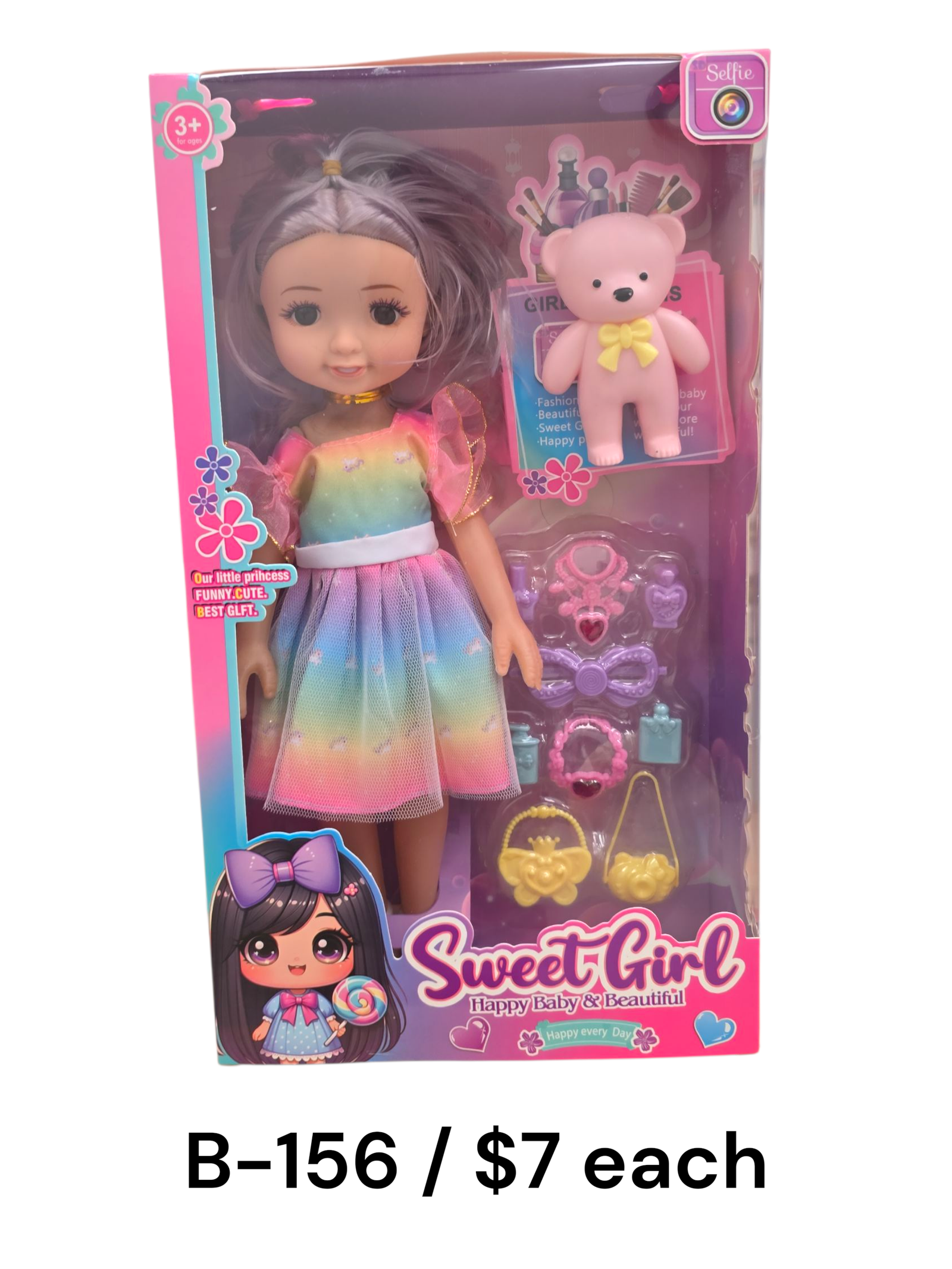 The B-156 Sweet Girl Doll is a delightful toy that brings style and fun to every playtime. Dressed in a colorful rainbow dress, this doll is perfect for kids who love fashion and creativity. It comes with cute accessories like a mini teddy bear, handbags, jewelry, and hair clips, allowing children to mix and match for endless styling fun. Ideal for ages 3 and up, it encourages imaginative play and storytelling. Whether for a birthday or special occasion, this Sweet Girl Doll makes a lovely gift that inspires fashion adventures and hours of entertainment for little trendsetters.