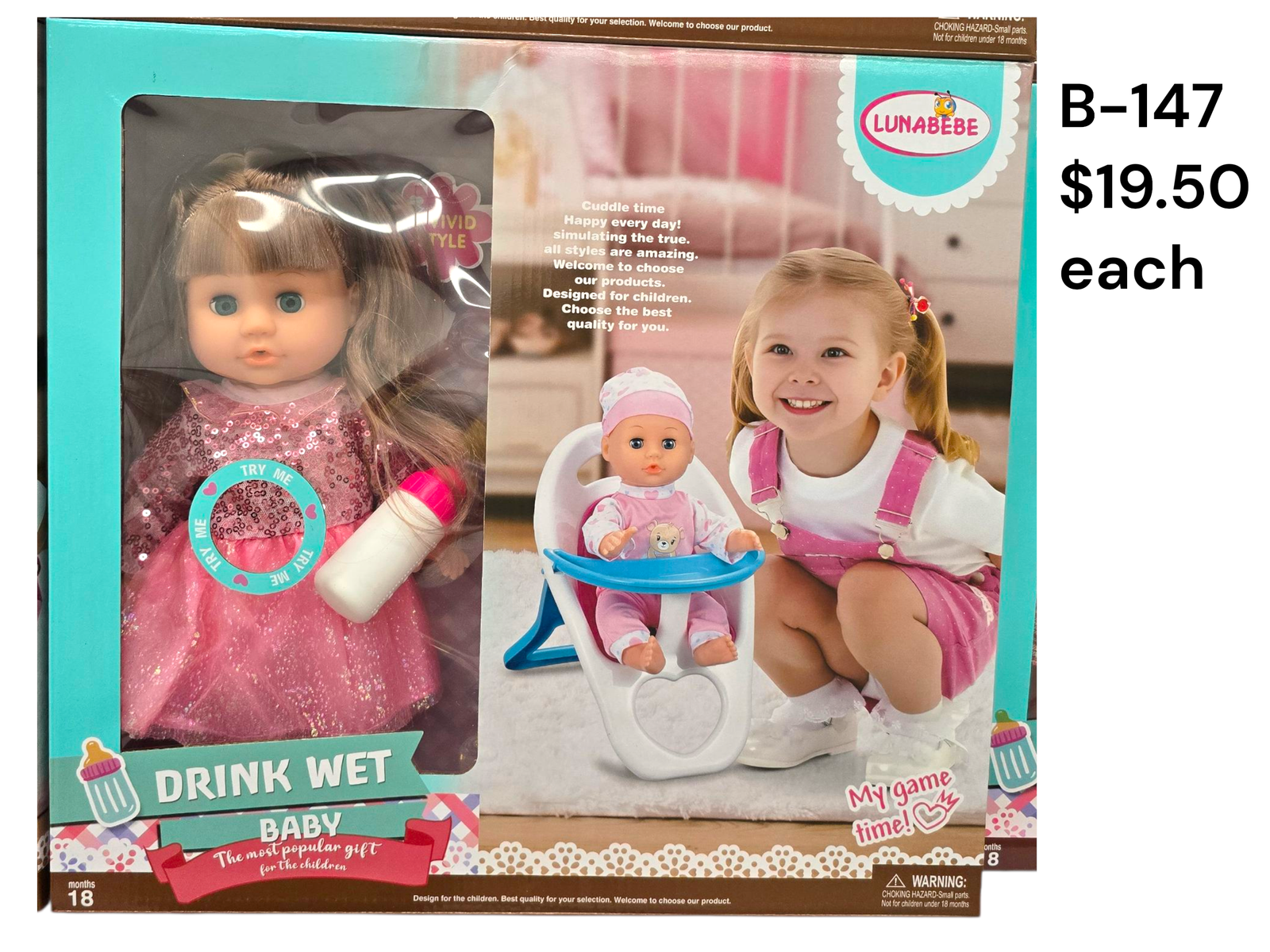The B-147 Drink Wet Baby Doll Playset brings fun and learning together with an adorable baby doll dressed in a sparkly pink outfit. It includes a feeding bottle and accessories, encouraging kids to engage in imaginative role play. Children can feed, cuddle, and care for the doll, enhancing their nurturing skills and creativity. Safe and easy to handle, this toy set is perfect for toddlers and young kids. Ideal for birthdays, holidays, or everyday fun, it’s a great way to inspire responsibility and kindness in little ones. A sweet and thoughtful gift choice for every child.