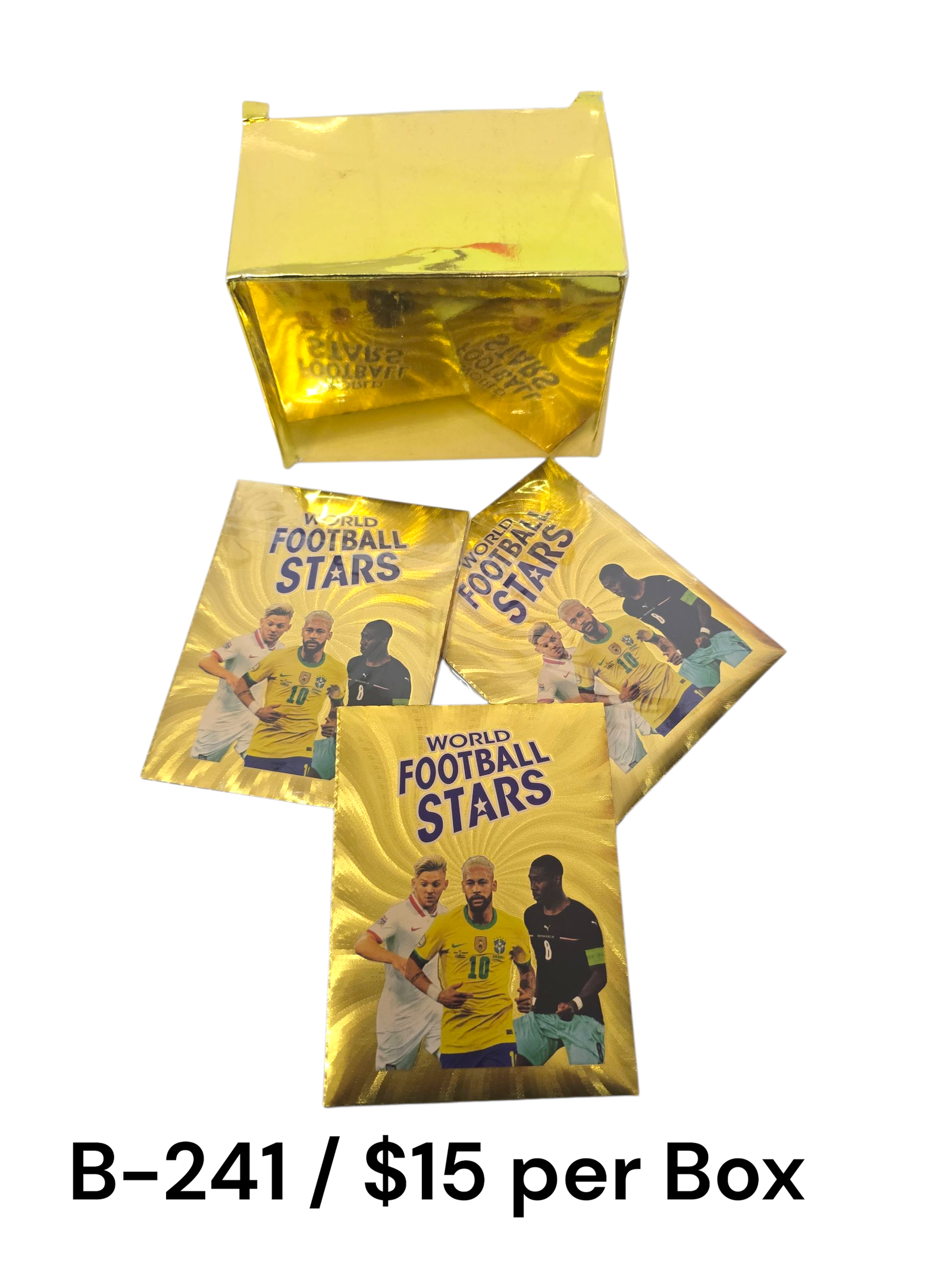 The World Football Stars Trading Card Pack Box (B-241) is a premium collectible set designed for football fans and card collectors of all ages. This box contains multiple sealed card packs featuring world-famous football stars, presented in eye-catching gold foil packaging that adds a premium look and feel. Each pack showcases high-quality printed cards with vibrant player images, making it exciting to open and collect.